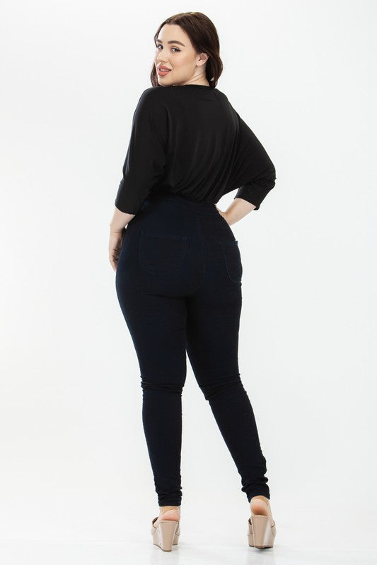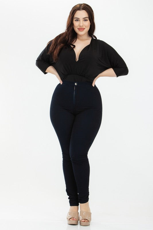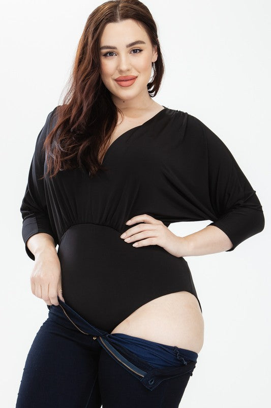 Everyone needs a simple black bodysuit in their life! Our version features a solid v-neck, three quarter sleeves, and a full back bottom that can easily be styled for date with the right jeans and a pair of heels.