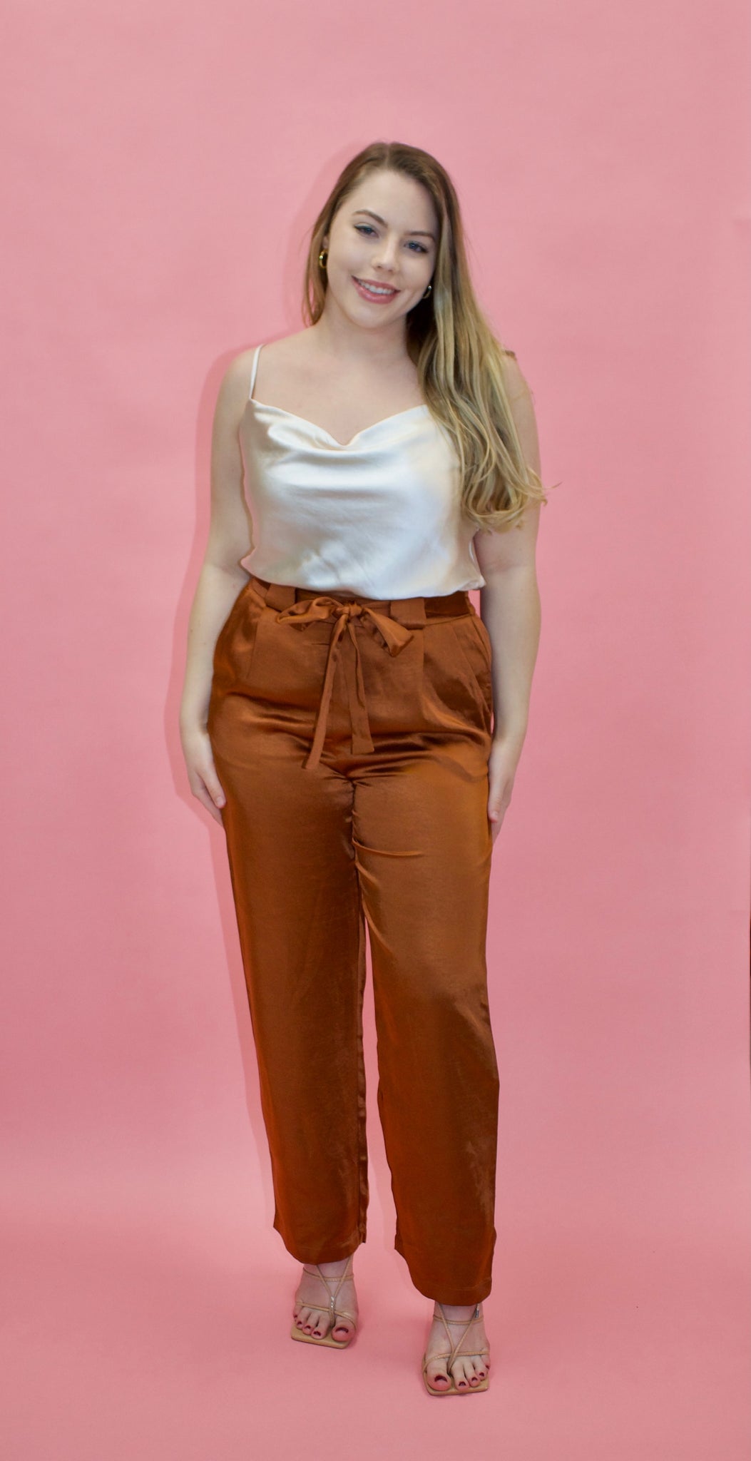 Straight Leg Satin Pants With Waist Tie & Pockets.