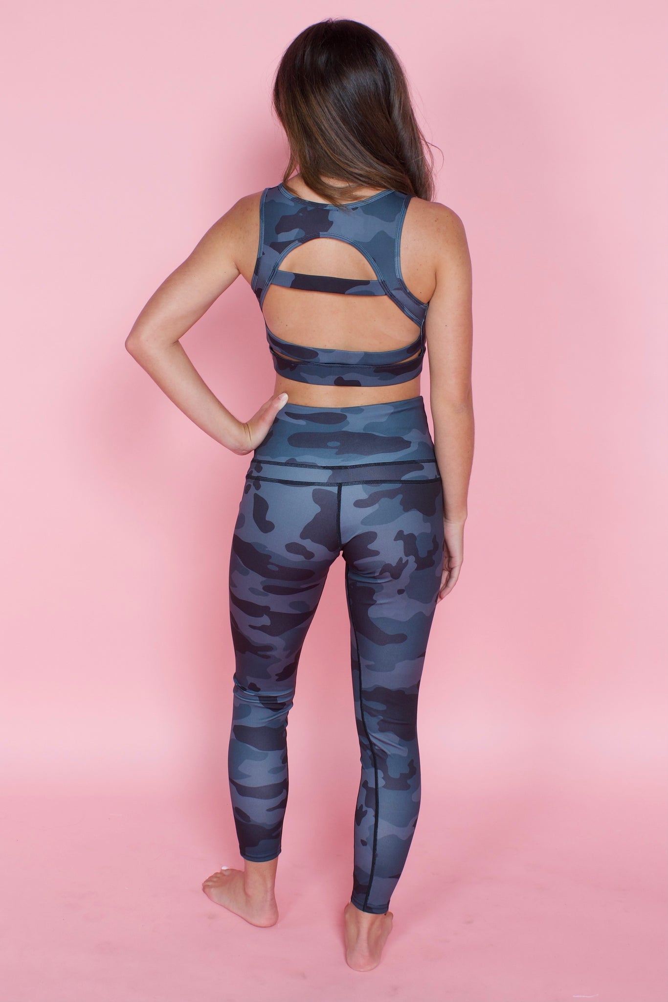 This style is made with breathable compression fabric in grey toned camouflage print. The front of the bra has mesh inserts, and the back has cutout details with strap bands.