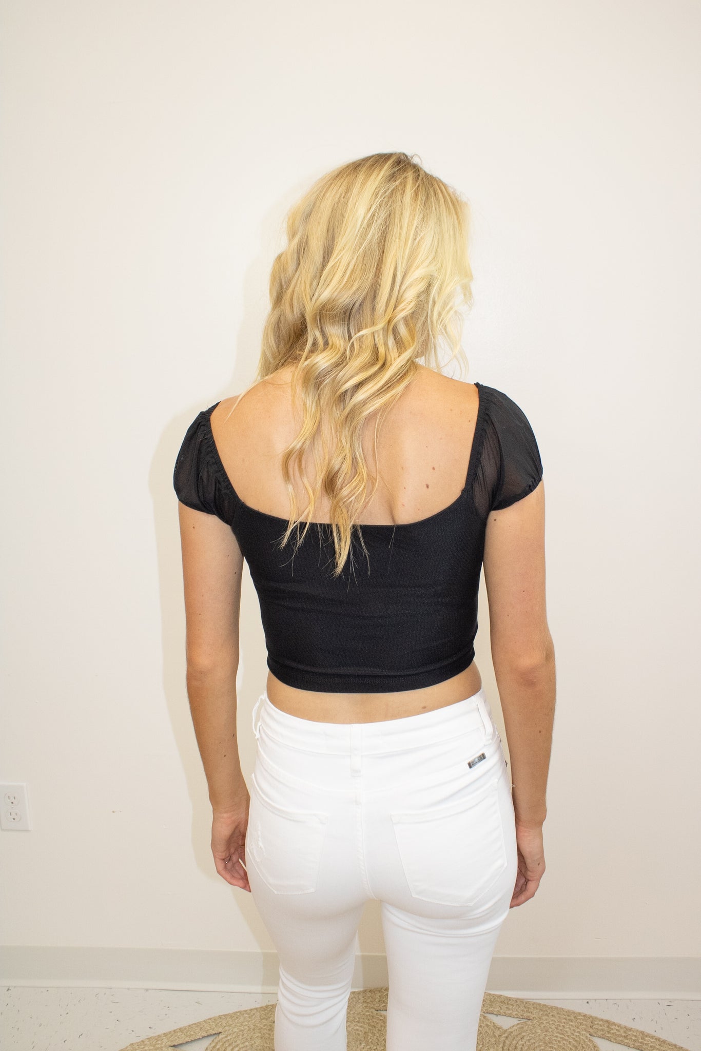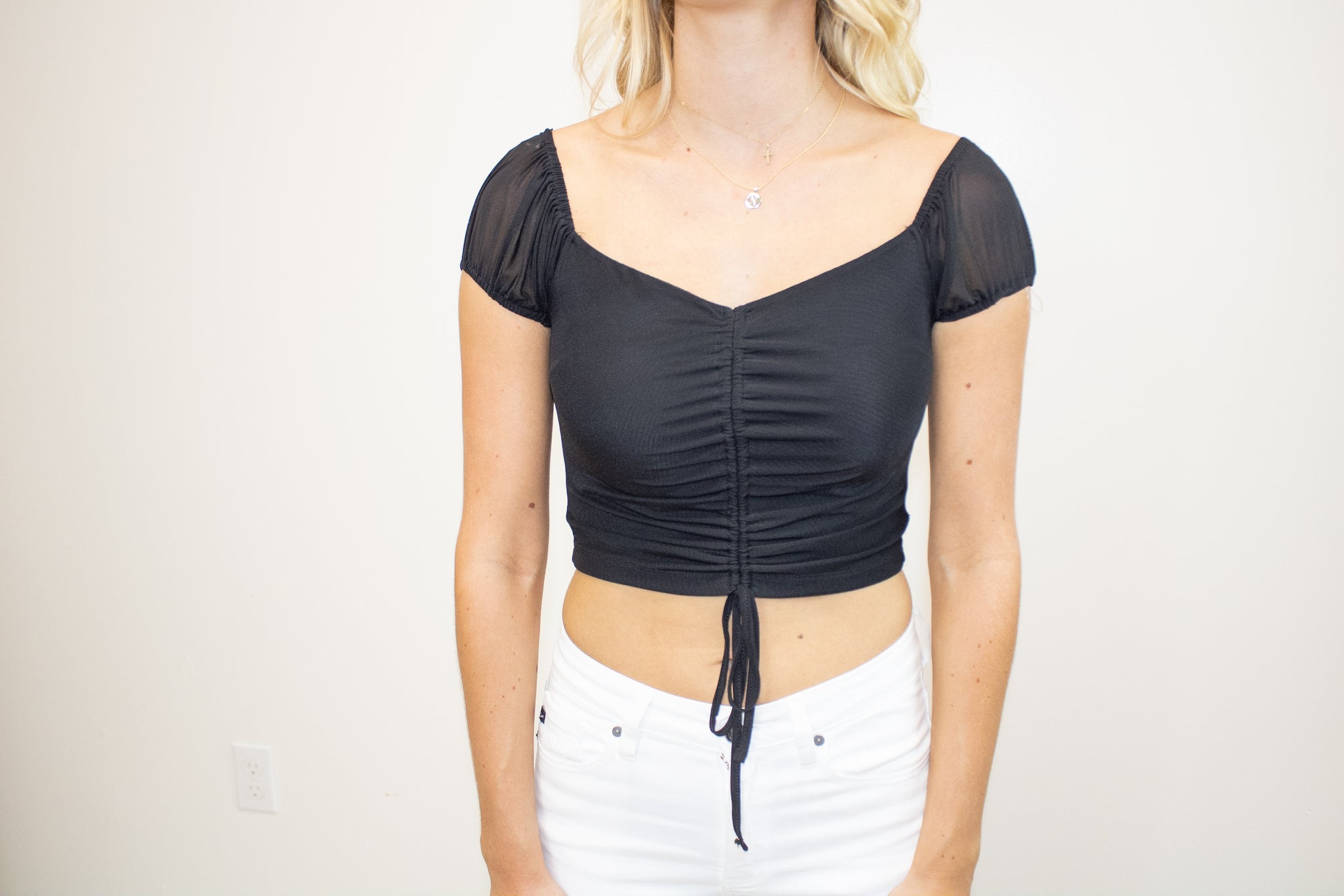 RUCHED CROP TOP WITH DRAWSTRING DETAIL AND PUFF SLEEVE IN MESH. LINED BUST, SHEER SLEEVES, GOOD STRETCH. SELF: 95% NYLON 5% SPANDEX CONTRAST: 95% POLYESTER 5% SPANDEX