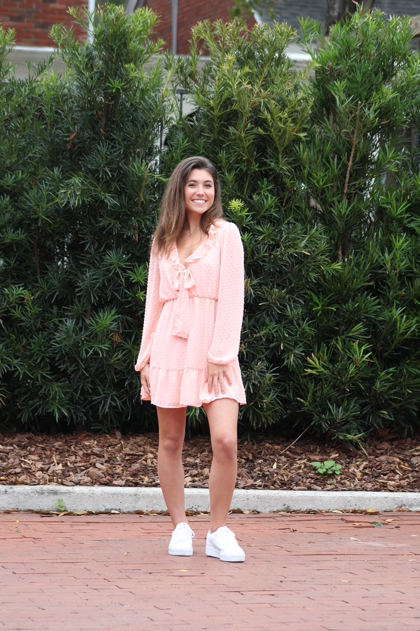 Fall in love with this adorable peach dress! This Flirty piece has swiss dots, flowy sleeves, and a front bow detail which allows it to easily stand out! Enhance its personality by pairing with casual sneakers for an outfit that is ideal for Easter brunch.